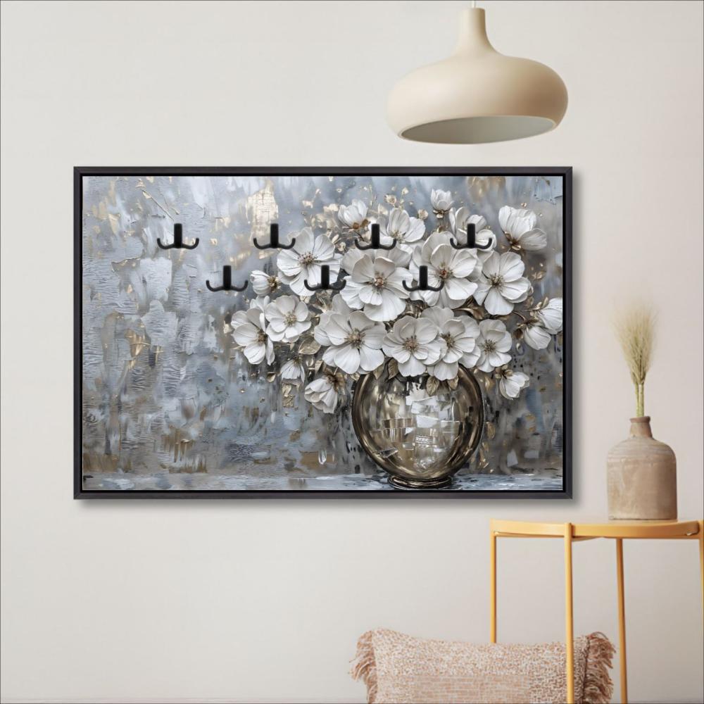 لوحة علاقة عبايات باقة زهور بيضاء في مزهرية ذهبية طباعة كانفس