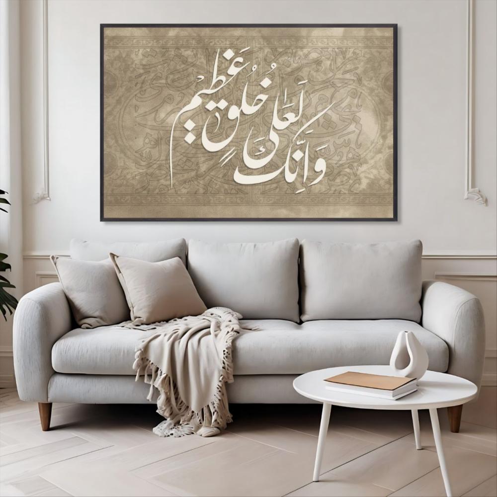 لصميم إسلامي راقٍ بخط عربي جميل لعبارة "وإنك لعلى خلق عظيم"، مع خلفية فنية مزخرفة بألوان بيج دافئة تعكس الطابع الكلاسيكي الفخم. تضيف لمسة روحانية وأناقة للمجالس، المكاتب، أو غرف المعيشة.