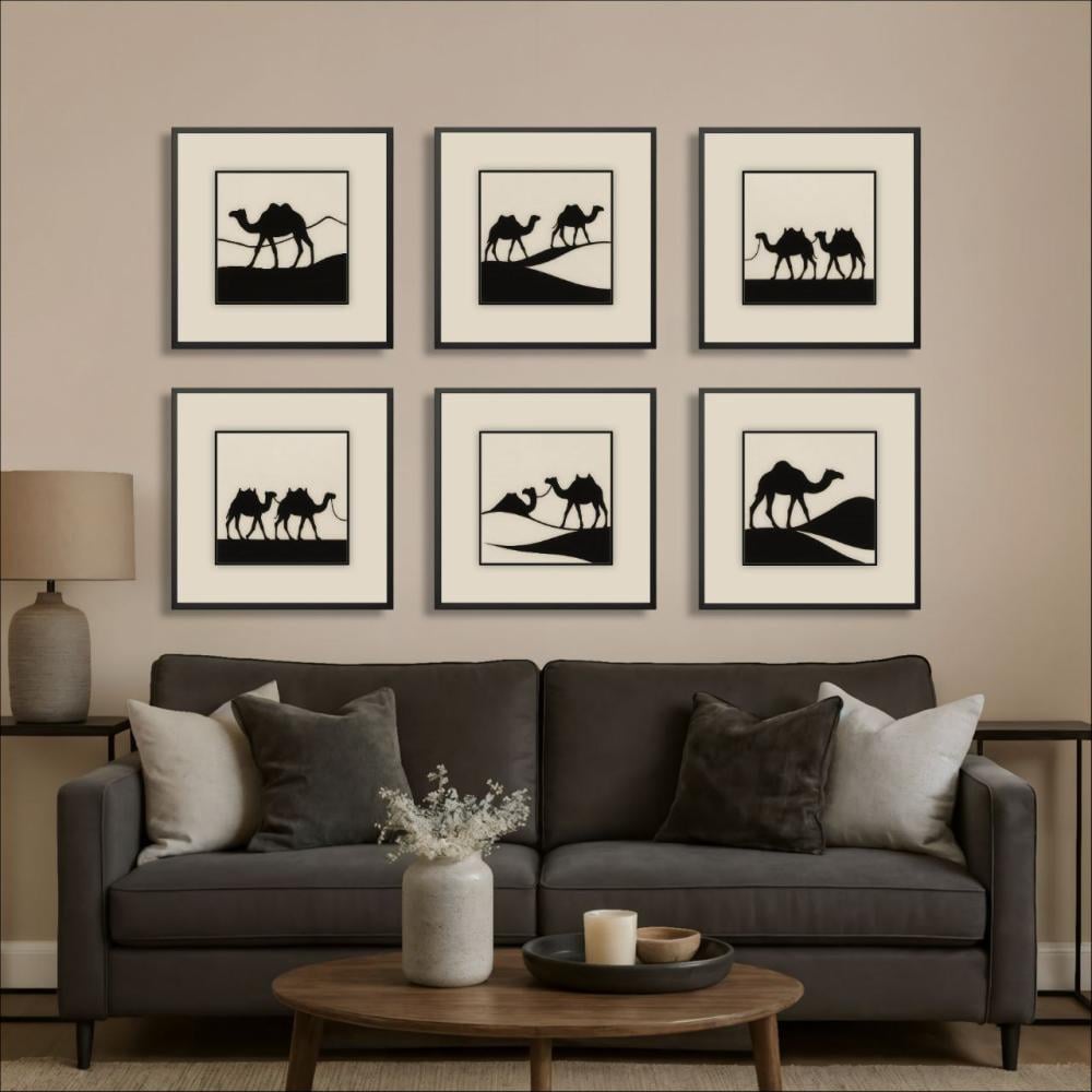 طقم أنيق مكوّن من 6 لوحات مربعة بتصميم بسيط ومعبّر يصوّر الجمال تسير في كثبان الصحراء بأسلوب ظلّ فني راقٍ.