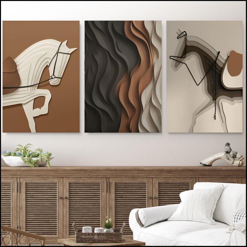 طقم 3 لوحات خيول بتصميم ناعم بدرجات البني طباعة كانفس فاخرة