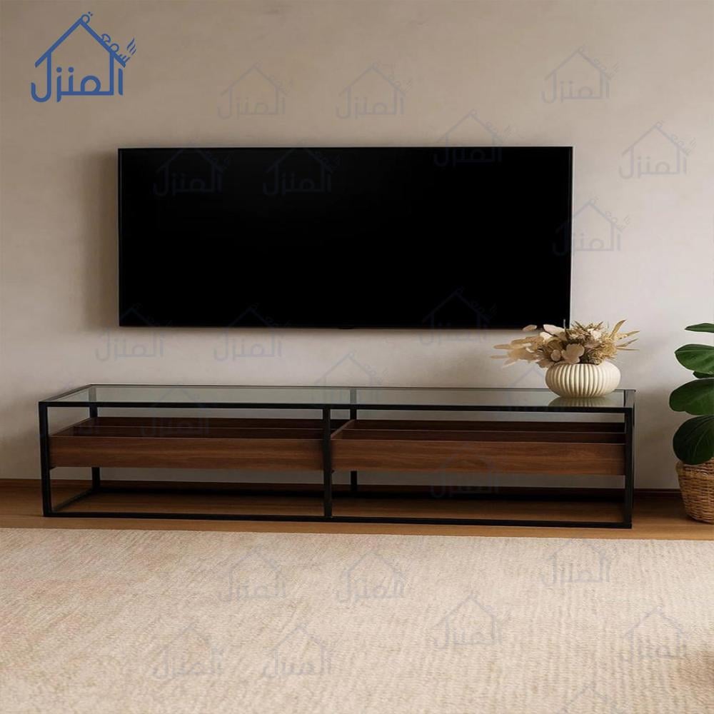 تصميم مودرن يجمع بين الخفّة والرُقي! طاولة تلفزيون بإطار معدني باللون الأسود وواجهة علوية زجاجية شفافة تعكس أناقة واضحة. الأدراج الخشبية بلون بني دافئ توفّر تخزين عملي للأجهزة الإلكترونية والديكورات. التصميم مثالي لمحبي البساطة واللمسات الصناعية العصرية، ومتوفر بعدة مقاسات لتناسب جميع المساحات.