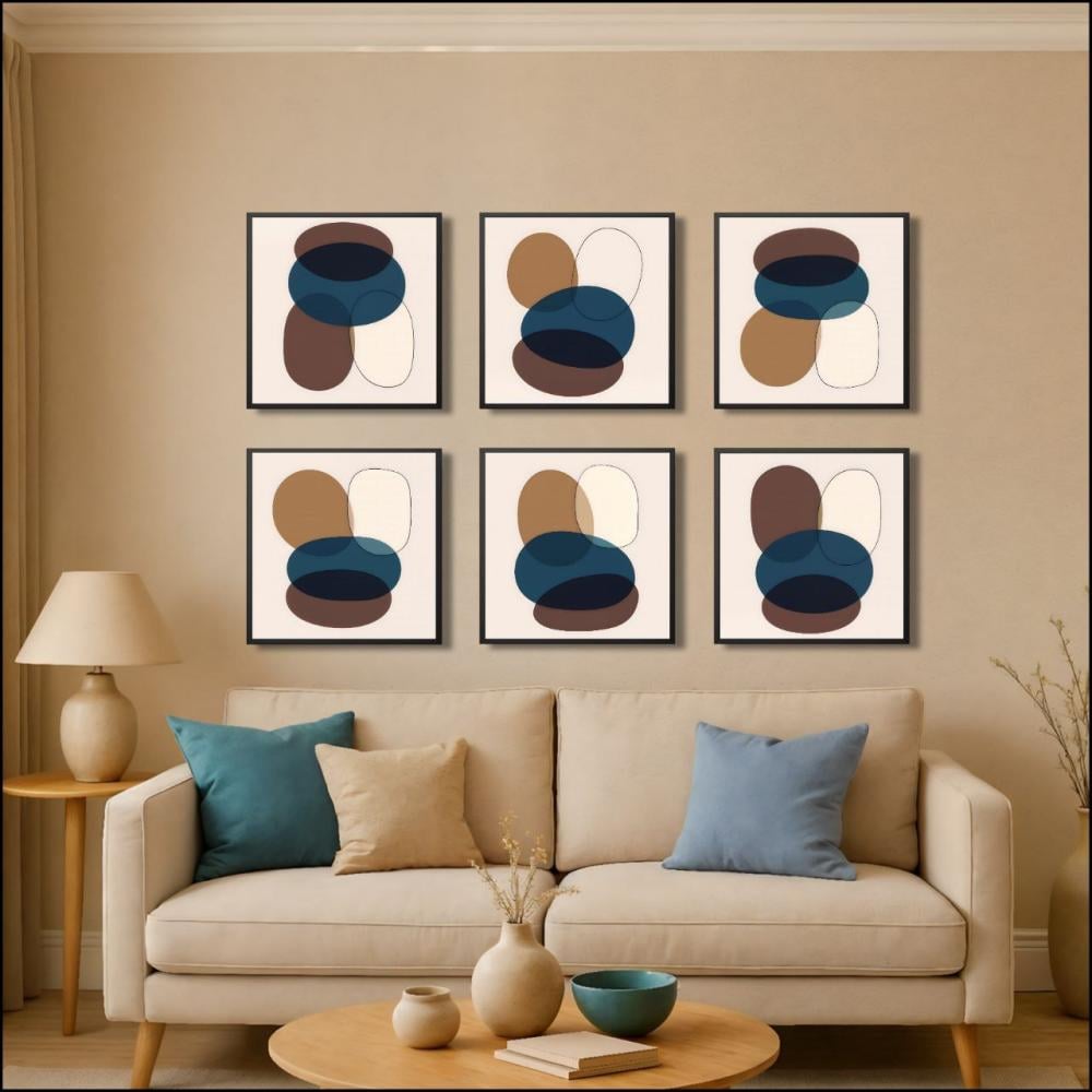 طقم أنيق مكوّن من 6 لوحات مربعة بتصميم هندسي تجريدي يجمع بين الدوائر المتداخلة والألوان الدافئة.