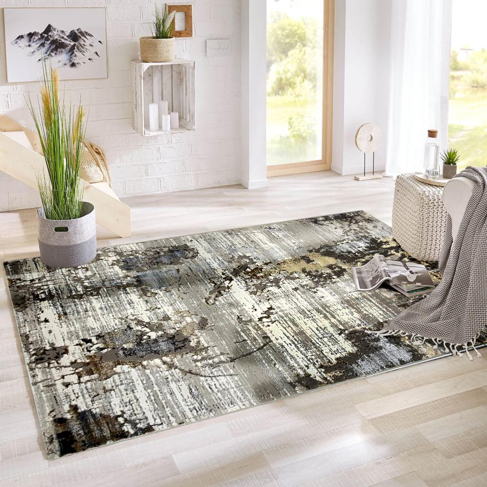 سجاد مودرن راقٍ بتصميم تجريدي وألوان ترابية هادية تجمع بين الرمادي والبيج ولمسات بنية وذهبية ناعمة تعطي المكان لمسة دفء وأناقة عصرية