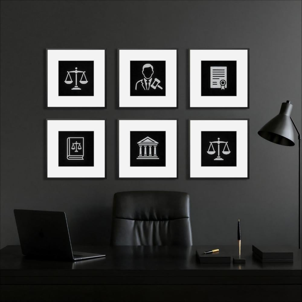 طقم فخم مكوّن من 6 لوحات مربعة بتصميم أنيق يعكس رموز العدالة والقانون مثل ميزان العدل، القاضي، والوثائق القانونية.