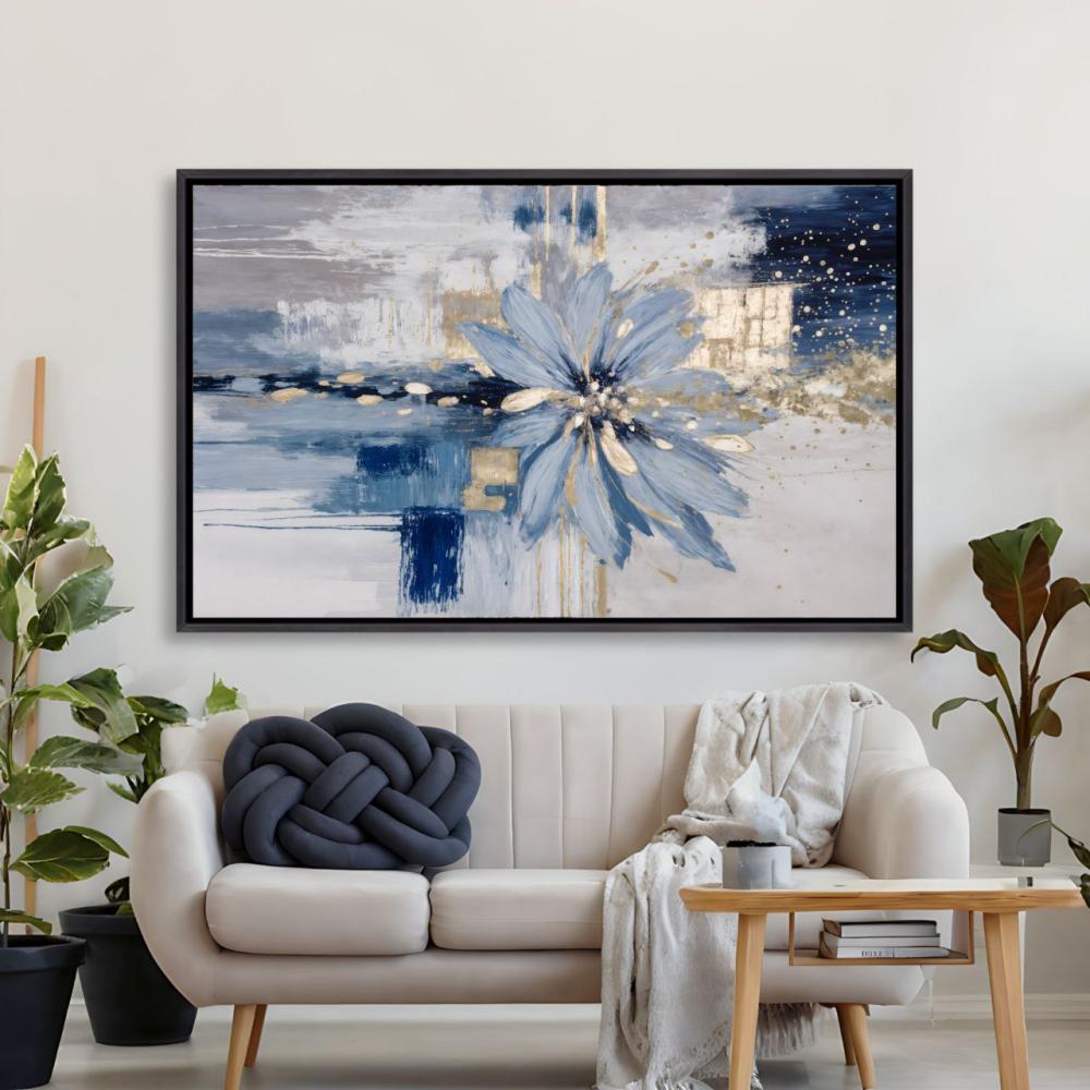 لوحة عرضي وردة زرقاء تجريدية بلمسات ذهبية طباعة كانفس