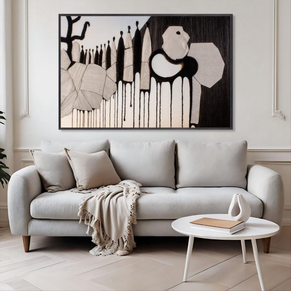 عمل فني تجريدي بلمسة عصرية يجمع بين الأشكال الهندسية والخطوط الانسيابية، مع تباين أنيق بين اللونين الأسود والأبيض ليضفي عمقًا وحركة على الجدار. خيار مثالي لعشاق الديكور العصري واللمسات الفنية الجريئة.