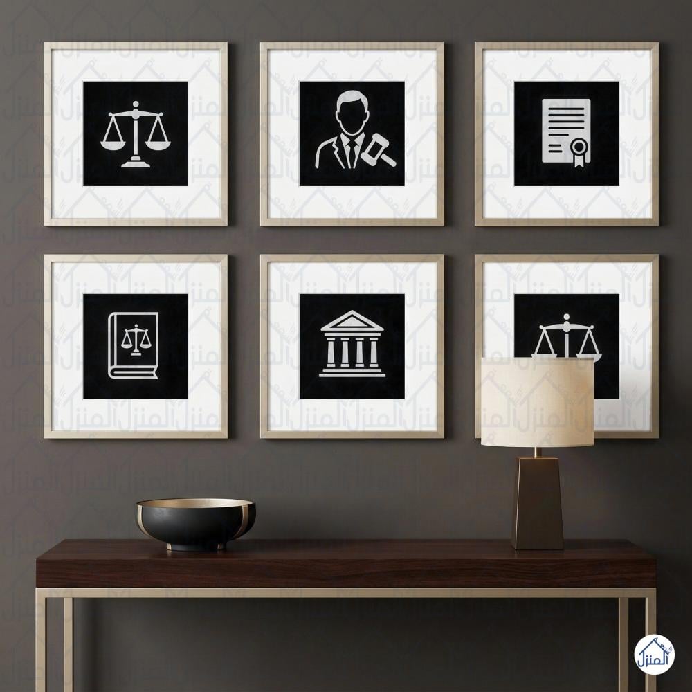 طقم فخم مكوّن من 6 لوحات مربعة بتصميم أنيق يعكس رموز العدالة والقانون مثل ميزان العدل، القاضي، والوثائق القانونية.